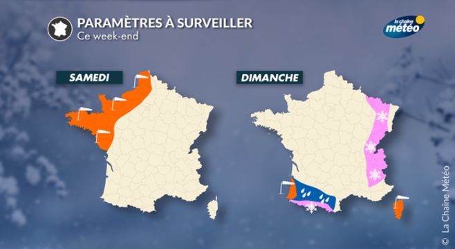 Ce samedi, alors qu'une perturbation traine encore des Pyrénées aux Alpes en apportant quelques faibles chutes de neige à moyenne altitude (1000-1500 m), une nouvelle perturbation aborde rapidement les côtes de la Manche. Dès la mi-journée, les pluies envahissent les côtes de la Manche et se renforcent dans l'après-midi. Ces pluies gagnent l'ensemble de la moitié nord d'ici à la soirée. En parallèle, un coup de vent se généralise au deux tiers nord-ouest de la France. Mais la période critique est surtout au moment de la bascule du vent à l'arrière du front où les rafales de nord-ouest pourront alors dépasser les 100 km/h sur le littoral. Prévoyez donc beaucoup d'agitation et redoublez de prudence dans vos déplacements si vous êtes dans ces régions cet après-midi et notamment dans la soirée. Si vous êtes près de la Méditerranée, vous pouvez profiter du soleil, mais il faut se couvrir en raison du mistral et de la tramontane qui soufflent à plus de 60 à 70 km/h en leur domaine.