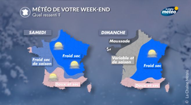 Le matin, il fera froid avec des gelées généralisées, parfois assez marquées sur les régions centrales. On observe des inversions de températures, avec du froid plus marqué en fond de vallée qu'en altitude. Mêmes les côtes et les bords de mer de l'ouest sont concernés par ce risque de gel. L'après-midi, on attend de 4 °C en plaine d'Alsace à 11 °C au pays basque, jusqu'à 16 °C dans l'arrière-pays méditerranéen. Les températures se situeront 1 à 2 °C sous les normales à l'est, comme pendant la semaine.