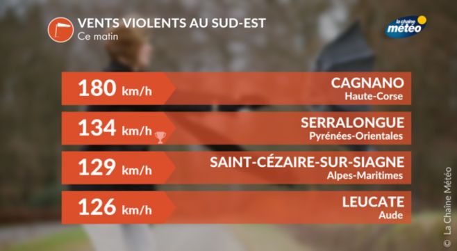 Samedi, les rafales tempétueuses ont donc touché le nord puis le sud de la France. En bord de mer, une rafale à 149 km/h a été relevée à Brignogan (29) et 147 km/h à la pointe de Chemoulin (44). On a relevé aussi une rafale à 135 km/h à Fécamp (76). Dimanche matin, c'est le nord de la Corse qui a été à son tour balayé par des vents tempétueux avec jusqu'à 180 km/h à Cagnano (2B). Le Roussillon et les Alpes-Maritimes ont également subit très localement des rafales tempétueuses, avec 129 km/h à Leucate (66) et à Saint-Cézaire-en-Siagne (06) et 112 km/h à Perpignan (66).
