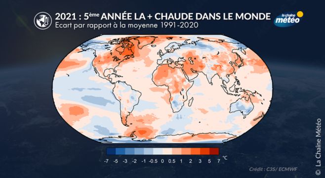L'année 2021 se place à la 5ᵉ place des années les plus chaudes depuis 1850. Malgré un niveau de température tiré à la baisse par le phénomène la Niña, 2021 enregistre un excédent de température de l'ordre de +1,16°C par rapport à la moyenne 1850-1900, la période pré-industrielle qui sert de référence.