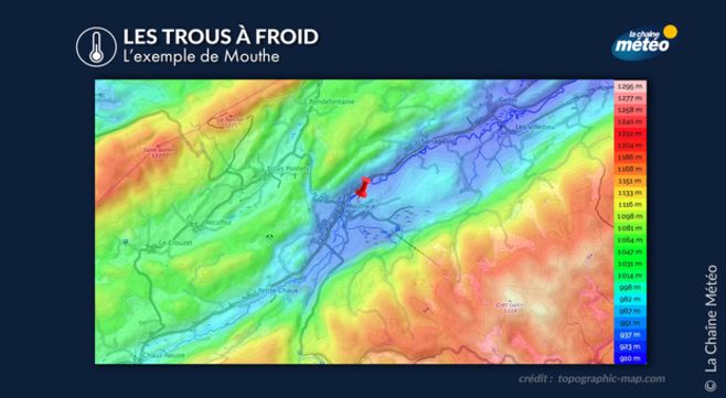 Si le record de froid est toujours détenu par le village de Mouthe (« La petite Sibérie »), lors de l’hiver 1985 avec -41°C, la multiplication des stations météos amateurs et professionnelles a permis à d’autres villages d’émerger dans le classement des villages les plus froids de France. On les trouve notamment dans le Haut-Doubs, le Jura, les Alpes, le Massif Central et les Pyrénées. Situés autour de 1000 m d’altitude, dans des vallées très encaissées, ce sont de véritables lieux de piège à froid appelés « trous à froid ». On l’observe encore cette semaine, dans une situation anticyclonique durable et propice à de très fortes gelées.