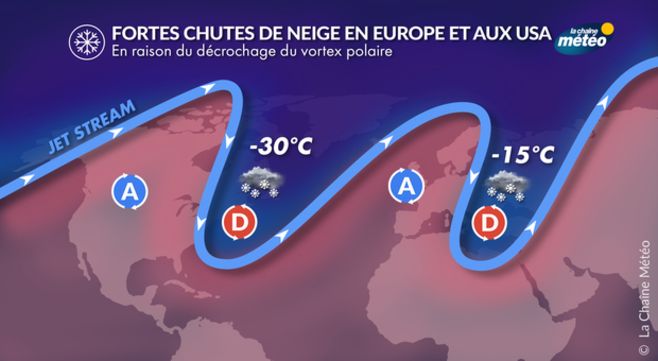 Ces oscillations du jet stream, appelées "vortex polaire", provoquent des descentes d'air froid vers le sud. Ainsi, une tempête de neige majeure a concerné l'est des États-Unis puis l'Ontario et le Québec. 300.000 personnes se sont trouvées privées de courant en Caroline et en Virginie où il est localement tombé 30 cm de neige. À Ottawa au Canada, il est tombé 46 cm de neige lundi, il s'agit d'un record pour un mois de janvier.