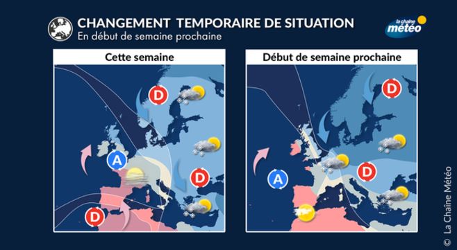 L'anticyclone, situé majoritairement entre l'Irlande et la France, est donc le moteur de l'évolution météo depuis trois semaines. Au vu de nos prévisions à moyen et long terme, il va maintenant se rétracter vers l'Atlantique en cette fin janvier et en première décade de février, permettant alors aux masses d'air polaires de plonger de l'Écosse vers les pays du Benelux et l'Allemagne. C'est la raison pour laquelle une première perturbation pourra descendre sur la France lundi 31 janvier, apportant un coup de neige sur nos montagnes après 20 jours de temps ensoleillé.
