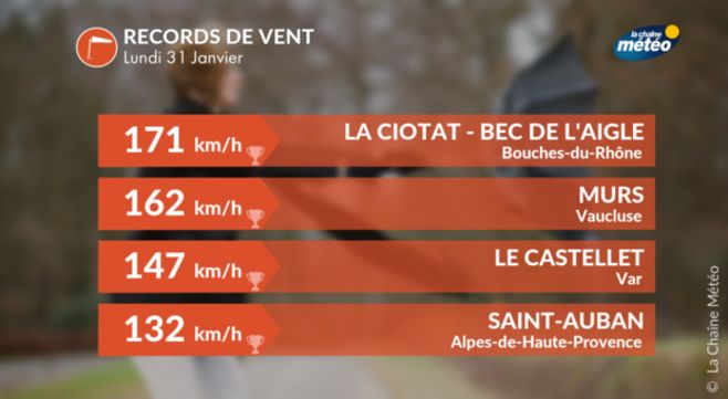 - violents mistral et tramontane du Roussillon à la Provence avec des rafales de 100 à 120 km/h