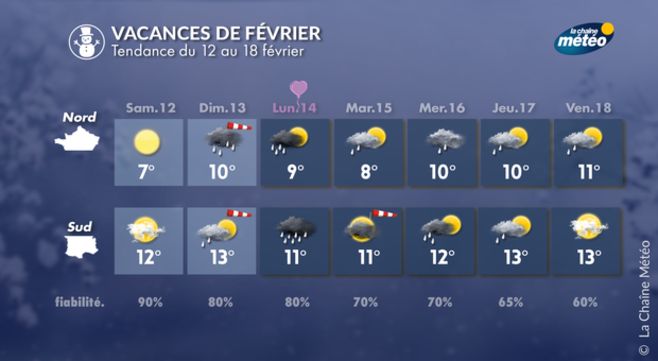 Pour une bonne partie de la semaine, les conditions météo seront dégradées. La journée du lundi, jour de la Saint-Valentin, sera heureuse mais pluvieuse et très ventée sur toute la France, avec un fort épisode de mauvais temps (pluie et vent) au sud-est. Cela constitue une bonne nouvelle pour ralentir la sécheresse et apportera une bonne couche de neige fraîche dans les stations de sports d'hiver des Alpes du sud. Mardi sera la journée la plus froide avec une baisse générale et temporaire des températures. La neige tombera à basse altitude sur tous nos massifs mais le sud-est se dégagera sous l'effet du Mistral.