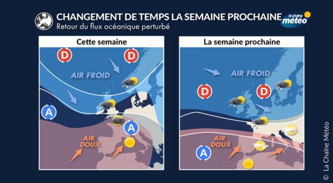 La tendance météo la plus probable pour la fin de semaine prochaine est à un temps qui resterait faiblement perturbé sur la moitié nord tandis que l'anticyclone pourrait à nouveau s'installer sur la partie sud du pays avec un temps plus sec et plus ensoleillé. Les températures seraient proches ou un peu au-dessus des normales de saison.