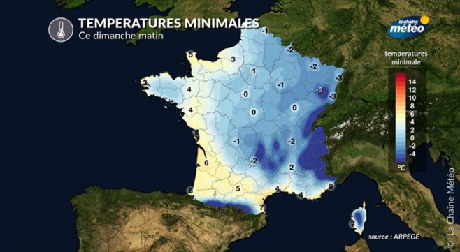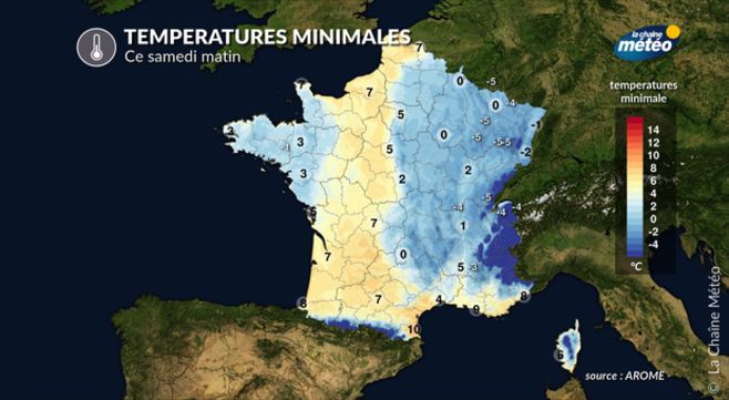 Avec un vent orienté au nord-est, canalisé entre l'anticyclone britannique et des basses pressions sur le bassin méditerranéen, les températures sont orientées à la baisse. Cette baisse sera surtout sensible dimanche car la bise sera plus mordante. Le matin, des gelées sont attendues en plaine sur la plus grande partie du pays. L'après-midi, les maximales afficheront 7 à 11 °C, soit 2 à 3 °C en dessous des normales. Ces valeurs seront même encore en baisse dimanche et pour le début de la semaine.