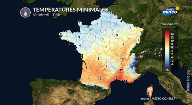 Les températures matinales sont assez basses avec quelques gelées blanches entre les campagnes bretonnes, normandes, franciliennes et dans les Hauts-de-France. L'après-midi, à la faveur du bon ensoleillement, les températures sont de saison, autour de 14°C en moyenne.