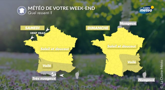 À l'image de cette semaine, les amplitudes thermiques sont importantes entre la fraîcheur du matin et la grande douceur de l'après-midi. Le matin, on attend 1 à 8 °C au lever du jour, avec quelques gelées blanches dans les campagnes du nord et du centre-est du pays. L'après-midi, grâce au soleil, il fait doux avec généralement entre 17 à 20 °C de maximum, un peu moins sur les côtes de la Manche (13 à 16 °C). Sur les régions méridionales, il fait moins froid la nuit à cause des nuages, ce qui évite le gel que nous avons connu cette semaine. D'une façon générale, les températures regagnent un à deux degrés dimanche, atteignant localement 21-22 °C sur les régions centrales.