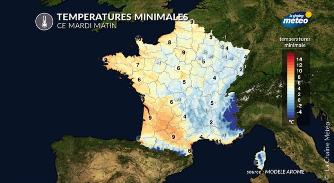 Les minimales affichent -2 à 7°C et les maximales 14 à 17°C.
