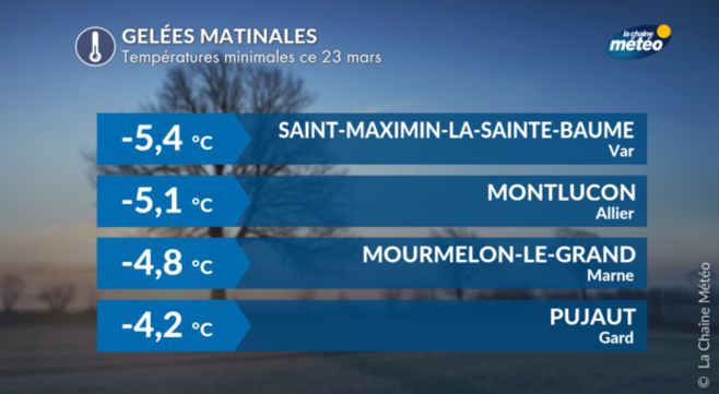 Alors que l'anticyclone maintient son emprise sur la France avec une semaine printanière et agréable, des inconvénients liés à cette situation se font sentir, tel que le gel matinal préjudiciable aux fruitiers, la sécheresse de surface qui gagne du terrain et la dégradation de la qualité de l'air.