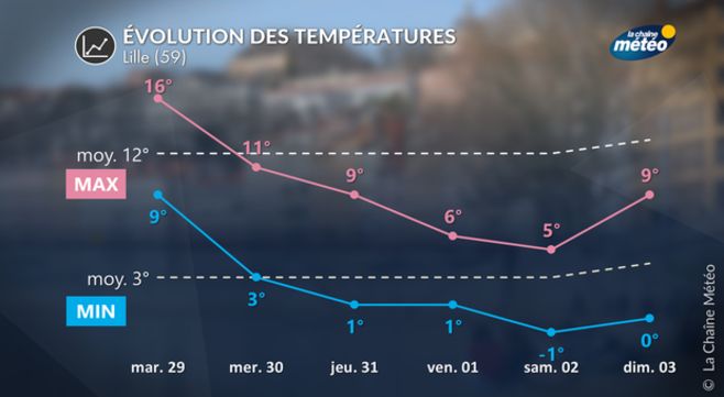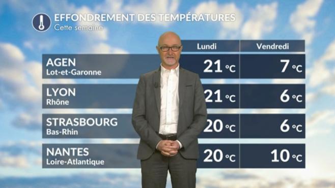 Mardi et mercredi, les conditions dépressionnaires vont se mettre en place sur l'ouest de l'Europe et sur la France, liée à la plongée du vortex polaire de Scandinavie jusqu'en Espagne en passant par la France. Ce vortex polaire s'accompagnera d'un air de plus en plus froid en fin de semaine, entre jeudi et samedi prochain. Cet air polaire maritime instable provoquera un effondrement des températures sur la France. Ainsi, sur Lyon, Paris, Lille ou bien encore Strasbourg, les températures maximales en fin de semaine seront proches de celles d'une fin de mois de janvier ! Elles se situeront 4 à 8 °C en dessous des moyennes ! Ce froid sera accentué par le vent du Nord qui soufflera de manière sensible, avec un risque de tempête de mistral et de tramontane près de la Méditerranée !