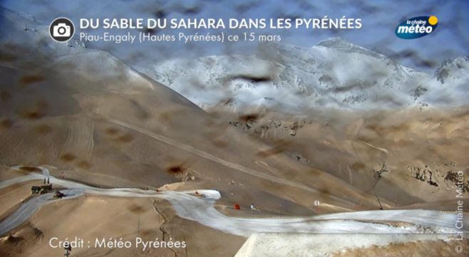 D'importantes quantités de sable du Sahara ont survolé la France à la mi-mars en lien avec un puissant flux de sud-est en provenance des Pays du Maghreb. Le ciel a pris des couleurs ocre ou orangé sur une grande partie du pays et on a pu observer des dépôts au sol et sur nos carrosseries de voiture, là où des précipitations se sont produites. Ce puissant vent de sud venu du nord de l'Afrique et transportant le sable du Sahara est appelé sirocco.