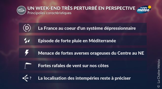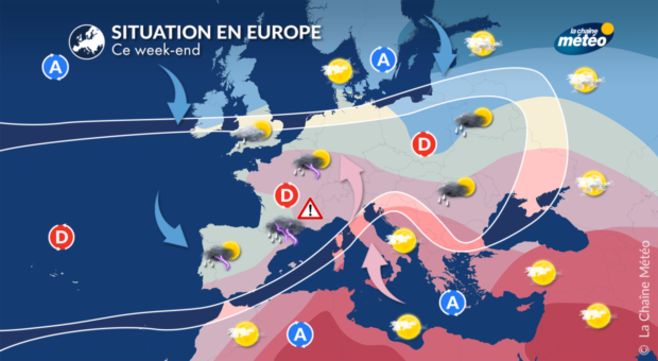 Ce samedi, la dégradation qui s'est mise en place hier soir sur les Pyrénées gagne tout le sud-ouest en matinée avec de fortes pluies orageuses. Ces fortes pluies, ponctuées d'orage, se décalent dans l'après-midi en direction de la Méditerranée. Le vent de sud souffle fort en vallée du Rhône et sur le Massif central, à l'avant des pluies et des orages. Au nord, le temps devient instable avec des averses ponctuellement orageuses. L'extrême nord-est reste à l'écart de cette instabilité sous un flux d'est asséchant la masse d'air.