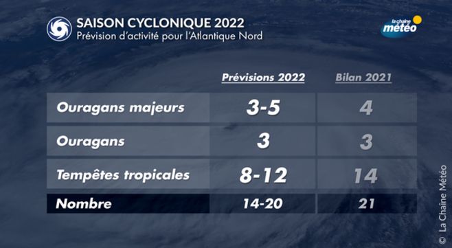 Ces prévisions rejoignent celles élaborées en mars par l'organisme météorologique américain Accuweather, qui envisageait de 16 à 20 phénomènes cycloniques, dont 3 à 5 ouragans majeurs, c'est-à-dire atteignant au moins la force 3/5 sur l'échelle de Saffir Simpson.