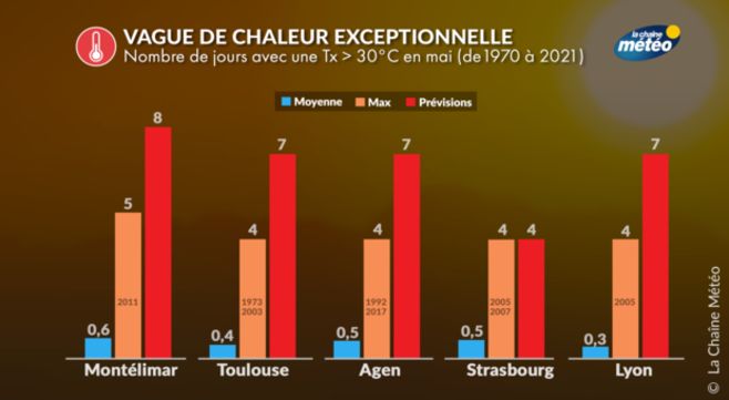- un nombre de jours de fortes chaleurs (températures > 30°C) jamais atteint depuis 50 ans sur certaines villes comme Agen, Toulouse, Montélimar, Lyon. Celui-ci pourrait ainsi atteindre, d'ici à la fin du mois, jusqu’à 8 jours à Montélimar, battant le record de 5 jours de 2011. Gardons à l’esprit, que le nombre de jours de fortes chaleurs en mai, sur ces 4 villes, est en moyenne de 0,5 jour sur les 50 dernières années.