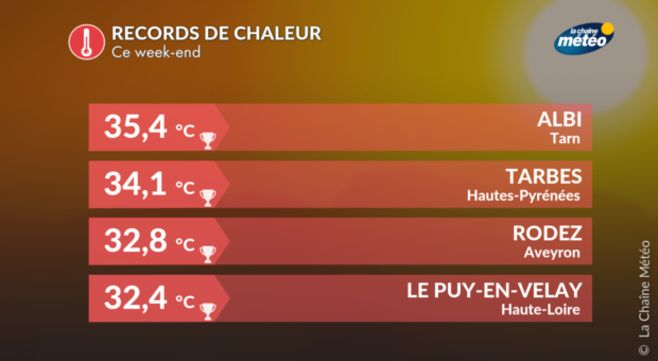 Dimanche, des températures ont à nouveau atteint des sommets dans le sud avec 3 records mensuels de chaleur battus à Tarbes (34,1°C), au Puy (32,4°C) et à Mende (33,4°C). Certaines communes ont connu des températures encore plus élevées, au niveau des valeurs d'hier.