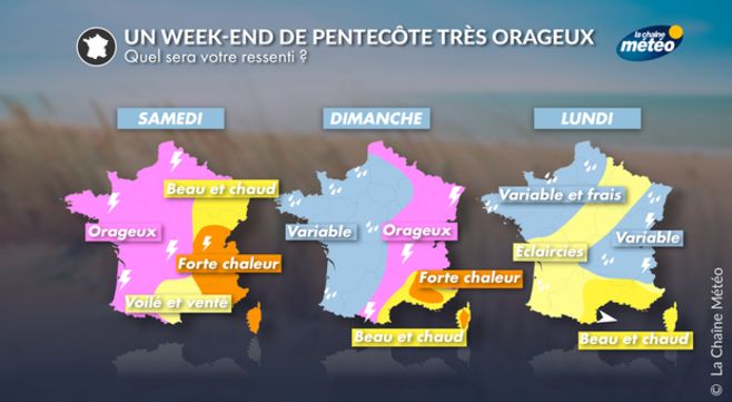 Ce week-end de la Pentecôte est très orageux, en particulier dans la nuit de samedi à dimanche. Toutes les régions ne seront pas forcément touchées, mais il faut craindre des phénomènes violents sur l'hexagone. Un temps plus calme et plus frais reviendra par l'ouest dès dimanche. Il faudra donc profiter des périodes d'accalmie entre les orages tout au long de ce week-end de trois jours.