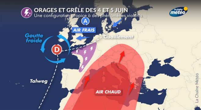 Dans le même temps, la situation météo était favorable à la grêle avec des cisaillements de vent (orientation du vent qui diffère avec l'altitude) et la présence en altitude d'une goutte froide, surmontant la masse d'air très chaude en surface.