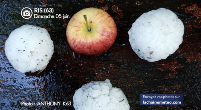 De nombreux grêlons de taille impressionnante ont été observés. Les plus gros d'entre eux atteignaient la taille de balles de tennis et ont eu pour effet de détruire des pare-brises de voitures, de faire des dégâts, notamment dans la Loire et l'Allier.