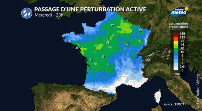 La France se trouve temporairement sous l'influence d'un flux océanique atlantique avec le passage d'une perturbation active donnant des pluies soutenues sur une bonne partie du pays. Après le passage de la zone perturbée, c'est un ciel de traîne qui prendra le relais avec un régime d'averses parfois orageuses.