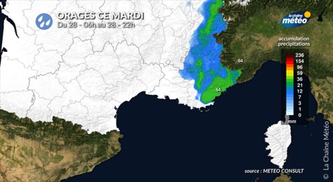 La région PACA ainsi que toutes les Alpes du sud subissent une forte dégradation orageuse. Le ciel est menaçant dès le matin, avec des températures élevées. Si des ondées orageuses sont déjà possibles le matin, la grosse dégradation se déclenche l'après-midi. De violents orages éclatent sur la montagne et gagne rapidement la Côte d'Azur. Il convient d'être prudent dans cette situation. La Corse reste en marge mais le ciel est tout de même menaçant. Il fait lourd, mais le vent d'ouest se lèvera rapidement en fin d'après-midi, chassant les orages vers l'Italie et faisant enfin baisser les températures.