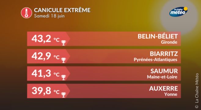 Les 3/4 est et sud de la France ont été concernés par un épisode de très fortes chaleurs à la mi-juin. Les plus fortes chaleurs ont concerné le sud-ouest et l'arrière-pays méditerranéen. On a relevé des records absolus de températures à Biarritz avec 42,9°C et Tarbes avec 39,2°C. De nombreux records mensuels de températures ont été battus : 40,5°C à Bordeaux, 40,1°C à Angers, 39,1°C à Nantes, 39,0°C à Blois, 37,9°C à Orléans et 36,6°C à Besançon.