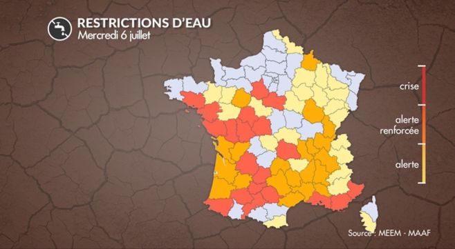 En ce début juillet, pas moins de 64 départements sont touchés par des restrictions d'eau sur au moins un de leur bassin-versant. Parmi eux, une vingtaine sont en niveau de crise avec interdictions de laver ses véhicules, d'arroser son jardin ou encore de remplir sa piscine...