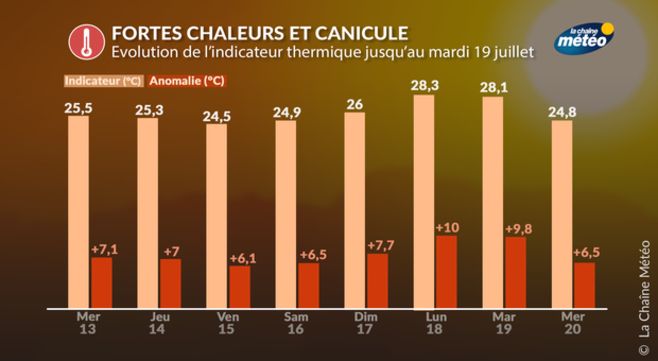 Pour mesurer l'intensité des vagues de chaleur, les météorologues utilisent l'indicateur thermique national, c'est-à-dire la moyenne d'une journée (nuit et jour) sur 30 villes représentatives en France. À partir de 25,3°C, on parle de vague de chaleur. On constate que ce nombre était de 12 jours consécutifs lors des canicules de 2003 et de 2006. Actuellement, on attend un indicateur thermique supérieur à 25°C ce mercredi et jeudi, puis à nouveau lundi et mardi prochain, avec possiblement un pic à 28°C mardi. Le record d'indicateur thermique à ce jour est de 29,4°C le 5 août 2003 et le 26 juillet 2019. Pour les jours suivants, en deuxième partie de semaine prochaine, la canicule devrait régresser vers le sud-est mais il semblerait que l'indicateur thermique reste encore élevé, proche des 25°C, ce qui pourrait prolonger la vague de chaleur sur certaines régions.
