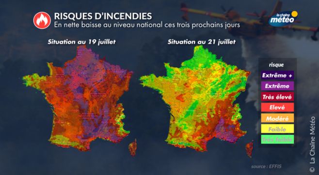 Vous l’avez compris, même si les conditions cette semaine s’améliorent partiellement, il faudra redouter les pics de fortes chaleurs attendus en fin de semaine et surtout ce week-end. De plus, peu ou pas de pluie n'est prévue sur les deux incendies avec le retour d'un vent sec, ce qui ne facilitera pas le travail de lutte contre le feu.