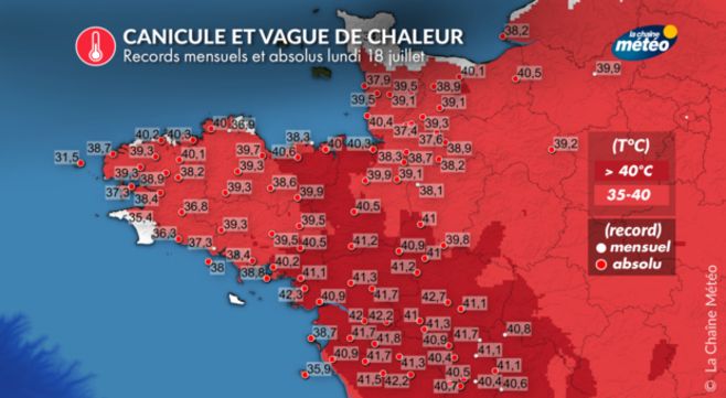 Sur ces deux dernières régions, cette journée de lundi a été historique d’un point de vue climatologique. Au total, près 108 records absolus et 123 records mensuels sont battus depuis le début de cette canicule. Près de 13 % des stations météo du parc français ont été concernées par ces valeurs qui n’avaient encore jamais été mesurées. À titre d’exemple, le record absolu de la ville de Brest, vieux de 73 ans, a été allégrement dépassé en s’établissant désormais à 39,3°C contre 35,2°C initialement.