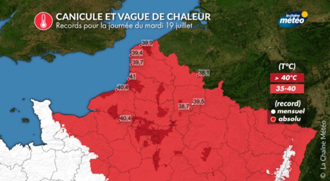 Cette canicule a été de courte durée sur le Nord-ouest. Les fortes chaleurs concernent ce mardi le Nord et le Nord-est du pays. C’est au tour de l’Île-de-France et des Hauts-de-France de connaître des valeurs proches de 40°C. Ces températures sont exceptionnelles et ne se sont produites que 2 fois en 150 ans à Paris-Montsouris. Pour autant, elles ne sont pas historiques et resteront moins élevées que les 42,6°C observées le 25 juillet 2019.