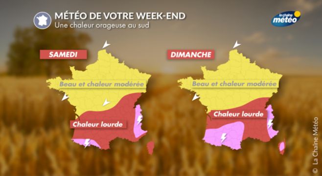 Pour votre week-end, la chaleur reste forte au sud alors qu'au nord, elle est beaucoup plus supportable en lien avec la levée d'un vent de nord-est qui limite un peu la hausse des températures. Si un beau temps sec domine dans le nord et l'ouest, il faut compter sur une ambiance plus instable au sud-est avec quelques orages en montagne.