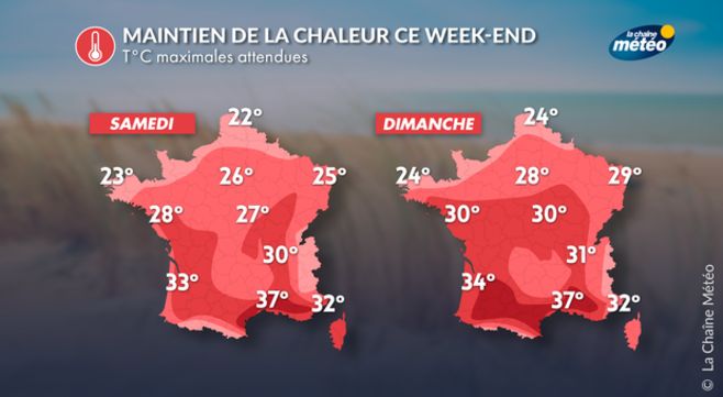 Les températures sont contrastées ce week-end avec 22 à 25°C près de la Manche, 25 à 30°C sur la moitié nord et de 30 à 35°C au sud, localement jusqu'à 37°C dans l'arrière-pays méditerranéen. Le vent de nord-est atténue les fortes chaleurs sur la moitié nord, avec également des températures nocturnes plus respirables, permettant d'aérer les habitations. En revanche, un tiers sud ne profitera pas de cet air et conservera un ressenti lourd et moite, même si la chaleur sera moins torride que cette semaine.