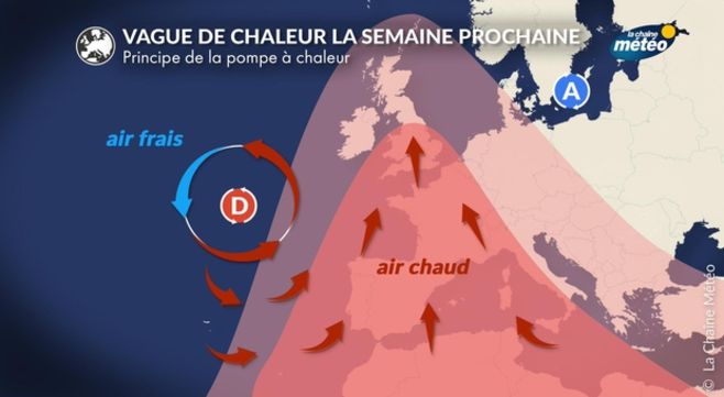 Dans le contexte que nous venons de décrire, un puissant anticyclone est présent sur les îles britanniques en ce début de semaine. Puis, de petites dépressions se formeront au large du Portugal, dont la localisation précise restera à déterminer. Cette situation est donc hélas favorable à la remontée d'air torride sur toute la France, par le sud, et gagnant progressivement vers le nord. Ainsi, la vague de chaleur s'installe depuis lundi, puis montera en intensité jusqu'à vendredi au moins. Une vague de chaleur se caractérise par un indicateur thermique national (moyenne des températures quotidiennes à l'échelle du pays) qui dépasse 25,3°C, puis qui ne redescend pas sous la barre des 23,4°C. Ce sera à nouveau le cas dès lundi, avec un maximum prévu autour de 26°C pour la deuxième moitié de la semaine.