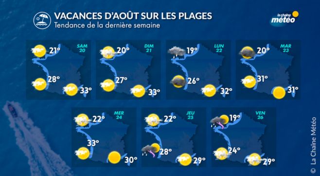 Les plages vont bénéficier globalement d'un beau temps estival dès ce week-end et la semaine prochaine jusqu'à jeudi, avant l'arrivée des orages sur l'ouest. Les côtes de la Manche et de la Mer du Nord connaîtront une journée grise avec des pluies faibles lundi, puis le soleil et la chaleur y seront de retour. Sur l'arc atlantique, il fera beau et de plus en plus chaud avec un pic de chaleur mercredi puis des orages jeudi. Ensuite, le vent tournera à l'ouest et le temps s'annonce moins chaud et variable en fin de semaine. Enfin, le beau temps se rétablit durablement en Méditerranée. Le mistral va cesser mardi. De belles journées calmes et chaudes rythmeront la semaine avant un temps plus mitigé vendredi, où des orages pourraient éclater sur les arrières-pays, une situation qui n'aura rien de comparable avec les intempéries de ces derniers jours. La Corse retrouve un temps calme et ensoleillé tout au long de cette période désormais.