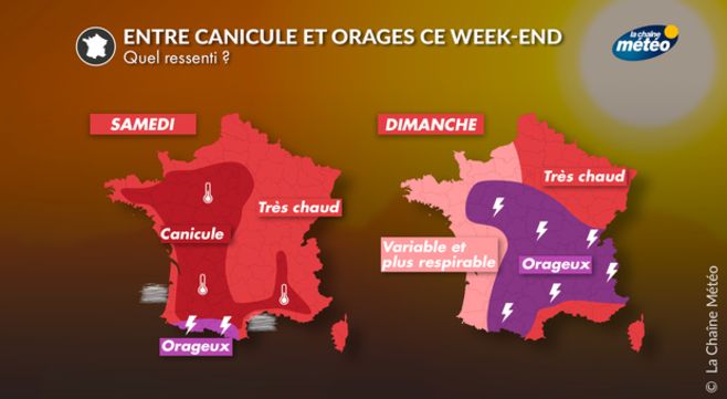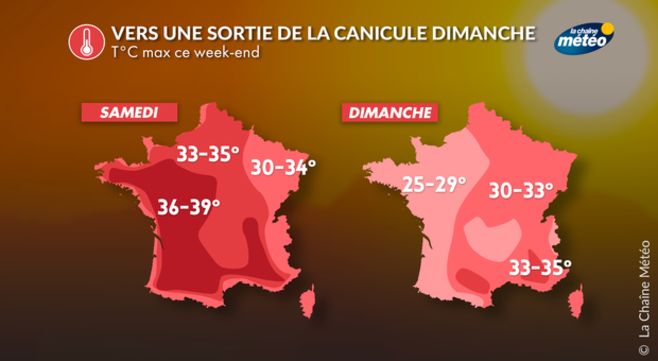 Demain dimanche, des orages sont attendus du sud-ouest au centre-est et ils pourront être violents, en liaison avec la remontée de la dépression portugaise vers le golfe de Gascogne. Les températures devraient baisser par l'ouest, mais resteront encore très élevées à l'est et au nord-est dans une ambiance lourde. Mais, avec un fléchissement des fortes chaleurs, ce sera la fin de la canicule en journée, après une nuit encore tropicale.