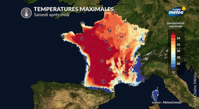 Les minimales sont comprises entre 17 sur le centre-est et 26°C à Nice. Les maximales affichent 32 à 38°C.