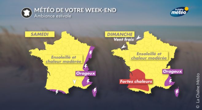 Les matinées sont très douces, avec 13 à 23°C de minimum des côtes de la Manche au sud-est. Rapidement, avec la hausse de la température combinée à l'humidité de l'air, le ressenti deviendra très lourd. Ce samedi après-midi, on attend 23 à 34°C. Demain dimanche, les fortes chaleurs se généraliseront au sud-ouest, en marge d'une dégradation orageuse sur le nord de l'Espagne. Les maximales atteindront 23 à 35°C.