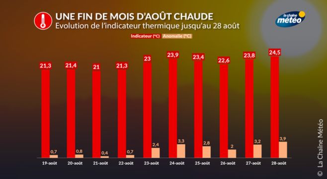 Après le passage des orages, notre indicateur thermique national met en évidence une baisse modérée des températures, qui rejoindraient alors les moyennes de saison. Le rafraichissement serait cependant relatif et temporaire, car une nouvelle hausse est envisagée pour le début septembre.