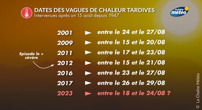 Après une semaine déjà très chaude sur un tiers sud du pays et alors qu'à partir du vendredi 18 août cette chaleur s'est étendue aux 3/4 du pays, il est utile de revenir sur les vagues de chaleur les plus tardives observées depuis 2009 en France, qui tendent à se répéter.