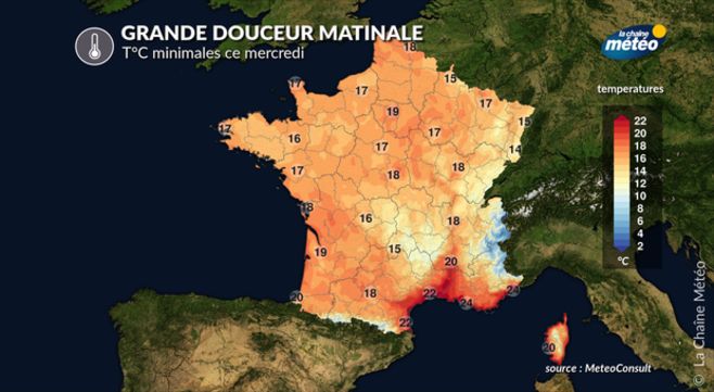 Ce mercredi, fortes chaleurs avec 30°C dépassés sur 75% du pays et des températures qui s'élèvent jusqu'à 36°C dans les Landes. Une dégradation s'observera en soirée sur le sud de l'Aquitaine, avant le développement d'une autre plus marquée dans la nuit sur la Bretagne et dont il conviendra de surveiller son évolution face à un risque de forte activité électrique et fortes précipitations temporaires.