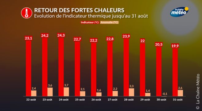 Ces fortes chaleurs se maintiendront sur une grande moitié est jeudi, alors que le mercure chutera parfois de 10°C, entre la Basse-Normandie et l’Occitanie, grâce à l’orientation du vent au nord, un rafraîchissement appréciable ! Vendredi, les fortes chaleurs ne se limiteront plus qu’entre l’Alsace et le Languedoc. A noter que cette tendance chaude pourrait se prolonger jusqu’à la fin du mois d’août, surtout sur le sud-ouest.