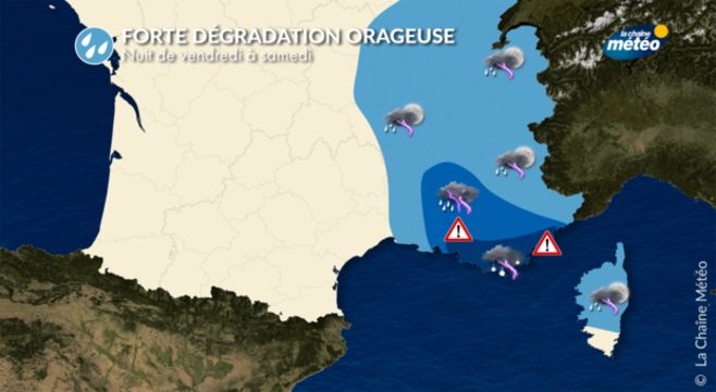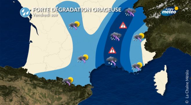La situation commencera à se dégrader en cours de journée de vendredi avec le déclenchement de nombreux orages. Les plus forts se produiront en cours d’après-midi en Languedoc-Roussillon, en liaison avec le creusement d’une dépression dans le golfe du Lion. Les vents marins feront remonter des orages et des pluies soutenues de vendredi soir à samedi matin jusqu’au centre-est, qui concerneront le couloir rhodanien et les départements limitrophes.