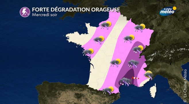 Après ce soir, de nouveaux #orages plus violents éclateront demain mercredi, qui sera la journée la plus dégradée de la semaine ‼️ Ils seront particulièrement forts en Languedoc et dans la vallée du Rhône ⛈️ pic.twitter.com/gLxMYzFTrn