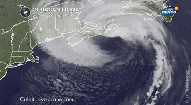L'ouragan Fiona est remonté sur la Nouvelle-Écosse. Même s'il a baissé en intensité la nuit passée, l'ouragan Fiona conserve ses caractéristiques cycloniques (catégorie 2/5 selon l'échelle de Saffir-Simpson) jusqu'à ce samedi 12 h (heure française) au niveau de la Nouvelle-Écosse au Canada qu'il frappe actuellement. Un record de basse pression a d'ailleurs été relevé au Canada avec 937,4 hPa à Hart Island à l'arrivée de l'ouragan Fiona ce matin.
