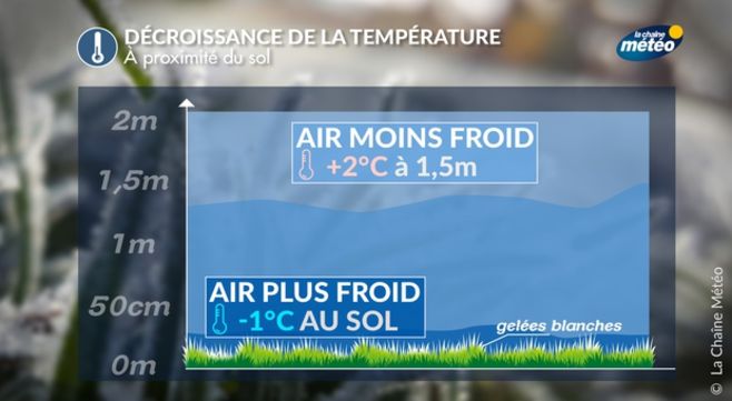 L'air le plus froid (le plus dense) se maintient sur une épaisseur d'une vingtaine de centimètres au-dessus du sol alors qu'à hauteur d'homme, s'observe une masse d'air moins froide, la différence pouvant atteindre 2 à 5°C.