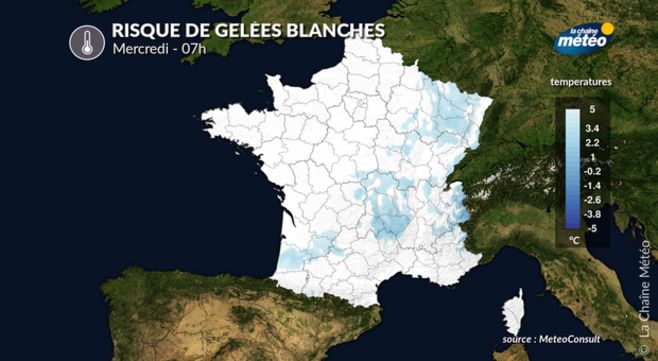 Au niveau des températures, la fraîcheur est à nouveau de mise et marquée ce matin. Pensez à bien vous habiller avec 5 à 10°C seulement en moyenne sur le pays. Des gelées blanches sont même observées localement du sud-ouest au centre-Est. Il fait plus doux près de la Méditerranée avec 12 à 15°C au lever du jour. L'après-midi, les maximales affichent le même niveau qu'hier mardi avec 17 à 20°C des côtes de Manche au nord de la Seine jusqu'au Grand-Est.