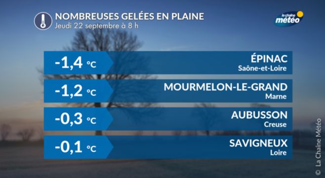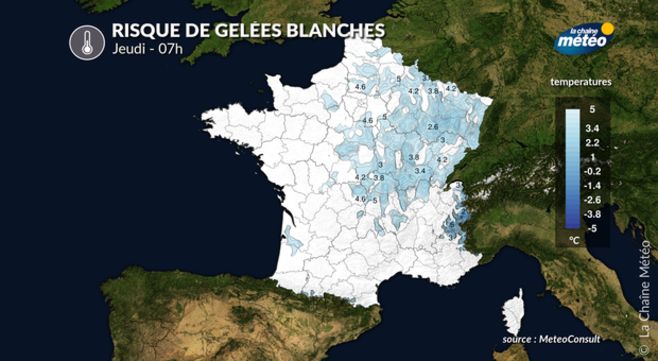 - la fraîcheur à nouveau très marquée ce matin, avec des gelées blanches du nord-est au centre du pays