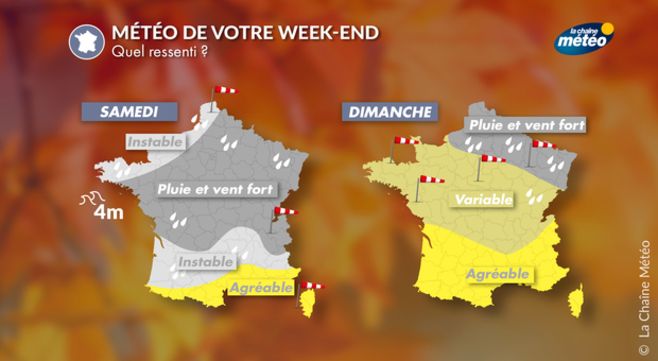 Samedi, le temps sera souvent maussade, mais doux, contrastant avec la semaine écoulée. Une forte perturbation concernera les deux tiers nord du pays en matinée avec pluie et vent fort, avant de s'atténuer l'après-midi du centre-ouest au nord-est et à la Franche-Comté. Le temps y restera très nuageux avec des pluies intermittentes. Pour la Normandie, les Hauts-de-France et l'Ile-de-France, de belles éclaircies reviennent l'après-midi. Dans l'extrême sud, du sud de la Garonne et des Pyrénées aux Alpes du sud et à la Méditerranée, le ciel sera ensoleillé avec une grande douceur, mais le vent d'ouest soufflera fortement sur le Var et la Corse.